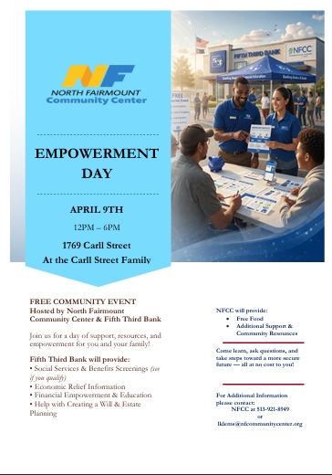 NFCC, in partnership with Fifth Third Bank, invites you to Empowerment Day on April 9th from 12 PM to 6 PM at the Carll Street Family Center. Stop by for free food, helpful resources, financial guidance, and support for you and your family. We hope to see you there!